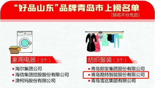 2022.03.143月2日,山東省政府新聞辦召開(kāi)新聞發(fā)布會(huì),介紹“好品山東”建設(shè)主要內(nèi)容、推進(jìn)情況及下步打算,并發(fā)布了第一批“好品山東”品牌名單,其中,青島酷特智能股份有限公司榜上有名。