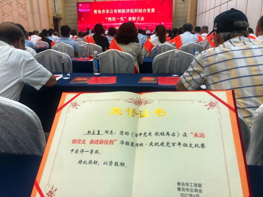 建黨偉業(yè),紅色華誕。6月28日,青島市非公有制經(jīng)濟(jì)組織綜合黨委召開“兩優(yōu)一先”表彰大會(huì)。得益于組織的肯定,酷特智能公司征文《百年黨史 航程再啟》在“永遠(yuǎn)跟黨走,奮進(jìn)新征程”慶祝建黨百年征文比賽中獲得一等獎(jiǎng)。