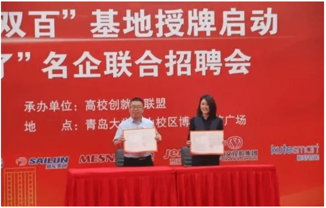 ▲酷特智能與青島大學(xué)紡織服裝學(xué)院進(jìn)行合作簽約,并發(fā)布“雙百”基地就業(yè)育人百日行活動(dòng)