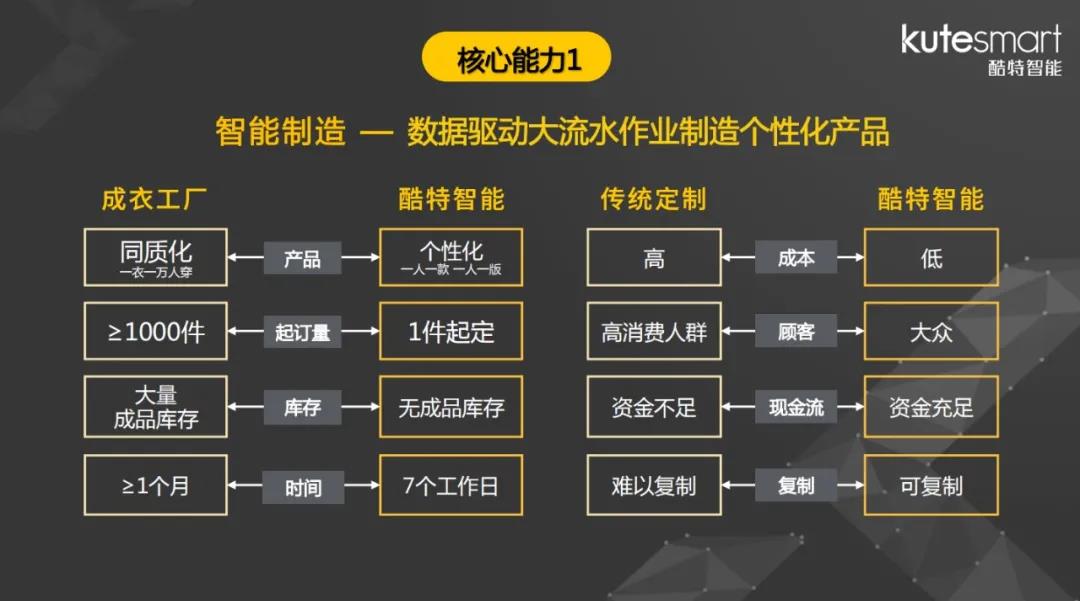 服裝是酷特智能C2M產(chǎn)業(yè)互聯(lián)網(wǎng)平臺的首個成熟的實(shí)踐案例及落地場景。2007年,面對服裝工廠之間價格上的惡性競爭和難以解決的庫存問題,酷特智能提出做定制個性化服裝的戰(zhàn)略,對傳統(tǒng)服裝供應(yīng)鏈進(jìn)行柔性化改造,將服裝行業(yè)平均1000件起訂、1個月以上交付的流程,縮短為1件起訂、7天交貨