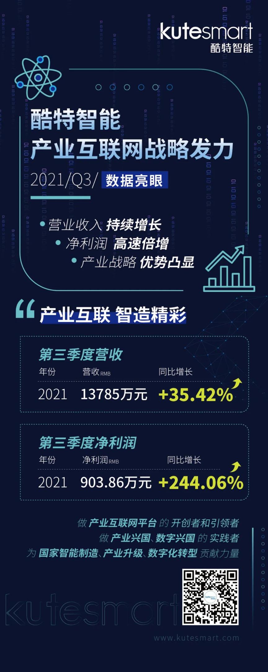 10月27日晚間,酷特智能(300840.SZ)發(fā)布2021年第三季度報(bào)告。公司2021年前三季度營收4.30億元,實(shí)現(xiàn)凈利潤4167.09萬元,其中第三季度營收1.38億元,同比增長35.42%;歸屬于上市公司股東的凈利潤903.86萬元,同比增長244.06%;扣非凈利潤547.89萬元,同比增長159.88%,其C2M產(chǎn)業(yè)互聯(lián)網(wǎng)平臺優(yōu)勢持續(xù)提升。
