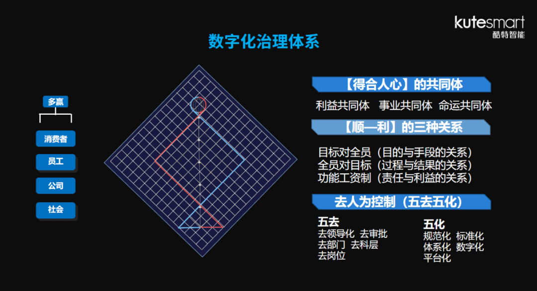然而,現(xiàn)代化生產(chǎn)的過程從來不是孤立和割裂的,生產(chǎn)過程的數(shù)字化,離不開整個工廠管理模式的數(shù)字化。如今在酷特智能看見的是,作為試驗田載體的個性化服裝定制能夠做到起訂數(shù)量最少,流水線上每件服裝都是不一樣的;在時間周期上,耗時最短,交付期限為7個工作日。而在實現(xiàn)這一切的背后,是酷特智能基于智能制造而對工廠進行的全方位、全流程的數(shù)字化治理改造??崽刂悄芡ㄟ^規(guī)范化、標準化、體系化、數(shù)字化、平臺化建設,實現(xiàn)了去領導化、去部門、去科層、去審批、去崗位等,完整建立了組織生態(tài)系統(tǒng)的方法論,還原人性,找回初心,實現(xiàn)了由人治到自治、從管理到治理的轉(zhuǎn)變。